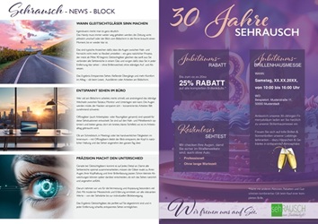 Unser Fokus liegt auf der Augenoptik-Branche, wo wir besonderen Wert auf Individualität legen. Unser jährlich wechselnder Werbemittelbaukasten bietet stets frische Ideen und Motive, um Ihre persönliche Kommunikation zu gestalten. Überlassen Sie uns die Arbeit und profitieren Sie von unserem umfassenden Service.